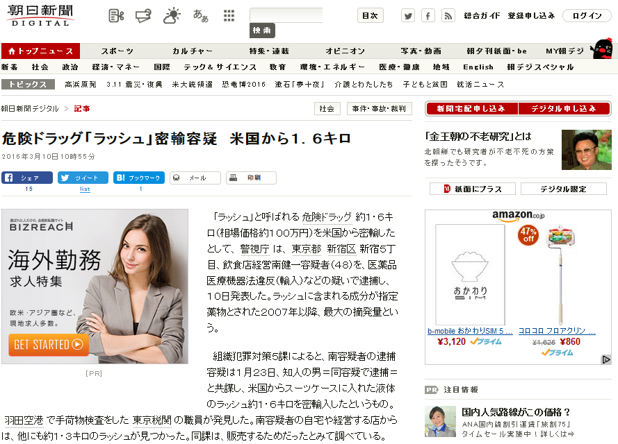 組織犯罪対策5課によると、南容疑者の逮捕容疑は1月23日、知人の男=同容疑で逮捕=と共謀し、米国からスーツケースに入れた液体のラッシュ約1・6キロを密輸入したというもの。羽田空港で手荷物検査をした東京税関の職員が発見した。南容疑者の自宅や経営する店からは、他にも約1・3キロのラッシュが見つかった。同課は、販売するためだったとみて調べている。